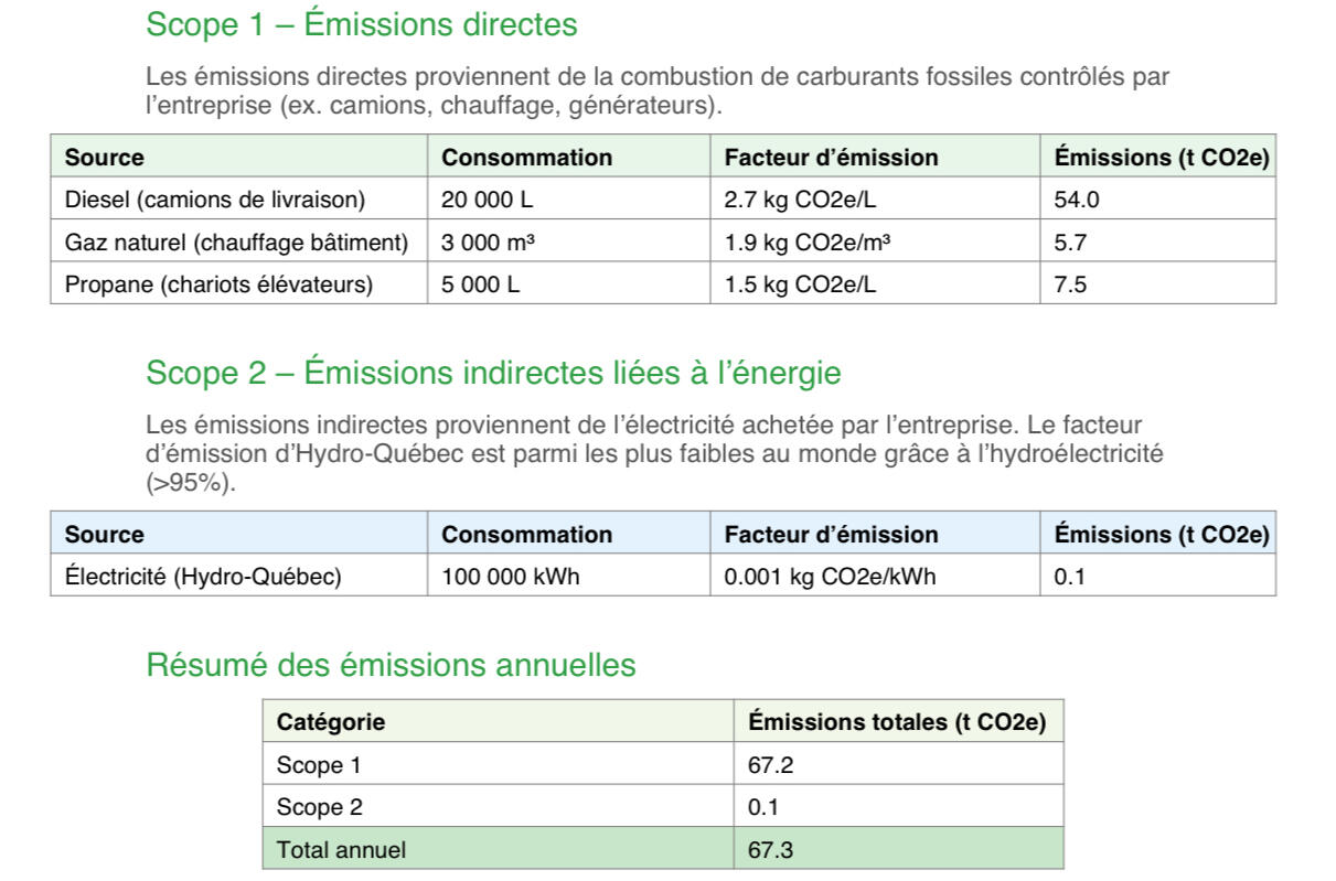 Nos rapports utilisent les facteurs officiels d’Environnement et Changement climatique Canada (2025) pour calculer les émissions. Les résultats sont précis selon les données fournies, mais ne constituent pas une certification officielle. Les documents transmis par l’entreprise demeurent strictement confidentiels et ne sont jamais utilisés à d’autres fins ni partagés avec des tiers.